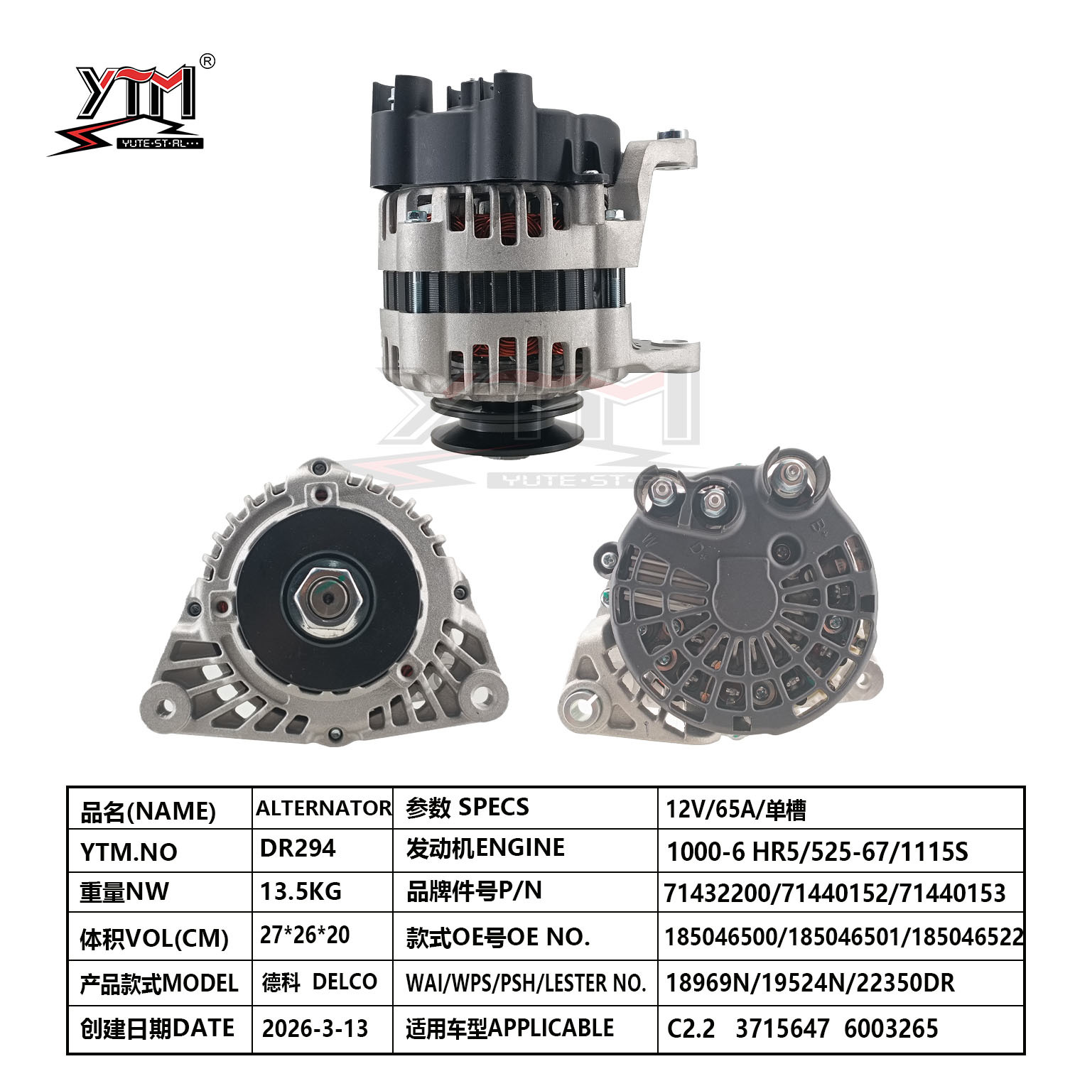 | Evidenziare: | DELCO C2.2 car alternator 12V 65A,DELCO alternator 71432200 with warranty,car engine alternator 185046500 compatible |